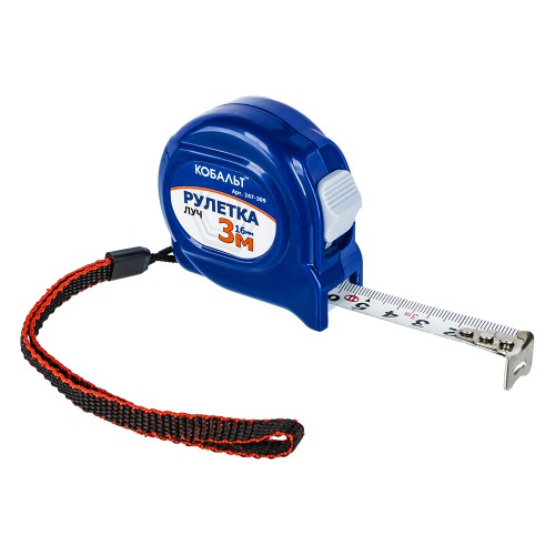 Рулетка 3м х 16мм КОБАЛЬТ 247-309 "Луч" предназначена для измерения небольших расстояний, снятия размеров, производства разметки при проведении строительно-монтажных работ. Корпус изготовлен из ударопрочного ABS пластика. Стальная лента толщиной 0,11 мм белого матового цвета имеет крупные контрастные значения шкалы, благодаря чему цифры легко читаются даже при слабом освещении. Через каждые 10 сантиметров цифры выделены красным цветом. Безрывковый надежный механизм обеспечивает плавный ход ленты. Рулетка имеет механический ползунковый стопор постоянно блокирующий ленту при переводе его пальцем в нижнее положение. Рулетка особенно хорошо подходит для работы с различными цветными строительными материалами. На корпусе закреплена жесткая стальная клипса для удобного ношения на ремне. Рулетка снабжена прочным плетеным ремешком-темляком, изготовленным из капронового волокна для ношения на запястье и страховки от падения. Длина 3м, ширина ленты 16мм