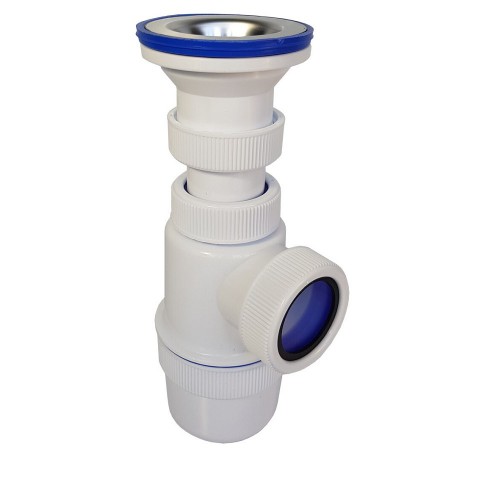 Необычная конструкция главного узла гидрозатвора бутылочного сифона - полый корпус, вставная труба. Позволяет легко производить очистку внутри самой конструкции, куда обычно сложно добраться. Для присоединения нержавеющей решетки используется винт длиной 8,5 см. благодаря чему сифон можно установить на раковины и мойки из любого материала. В том числе и с увеличенной толщиной стенки. Универсальная прокладка под выпуск имеет двухступенчатую структуру благодаря которой облегчается монтаж сифона на раковину или мойку.